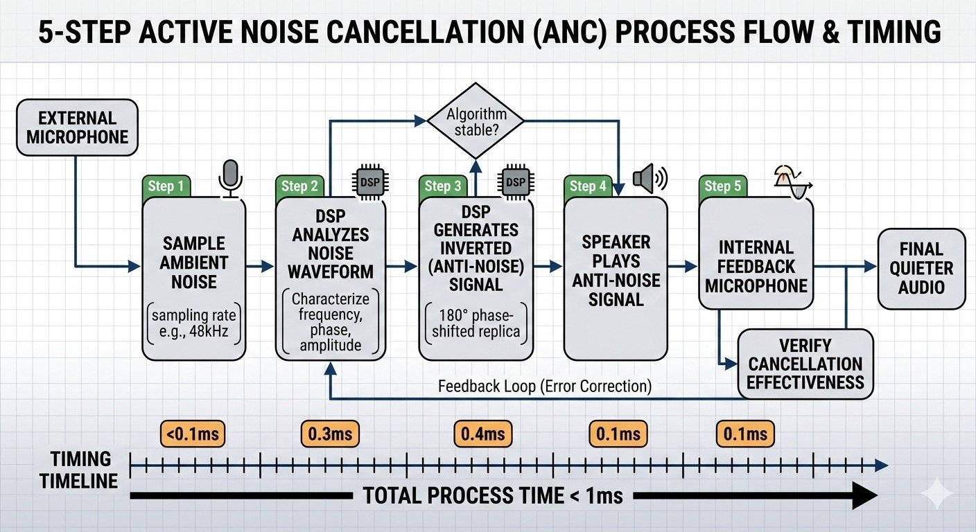 This entire process — capture, analyze, invert, play, verify — completes in under 1 millisecond. Any delay longer than this allows the original noise wave to pass before the anti-noise arrives, reducing cancellation effectiveness.