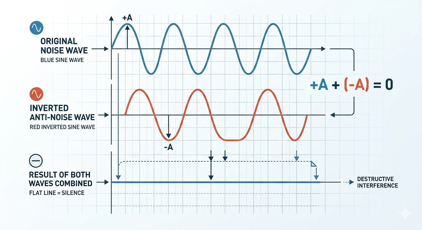 Active Noise Cancellation uses electronics to generate an “anti-noise” sound wave that cancels incoming noise through destructive interference — a physics principle where two waves of equal amplitude and opposite phase sum to zero.