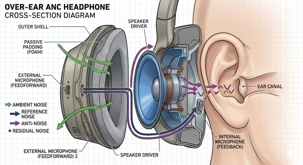 Implementation: Tight-sealing ear tips or over-ear pads (passive isolation) combined with ANC circuitry (active cancellation).