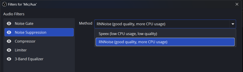 OBS Studio offers two methods. Speex uses less CPU but provides lower quality. RNNoise uses more processing power but sounds significantly better.