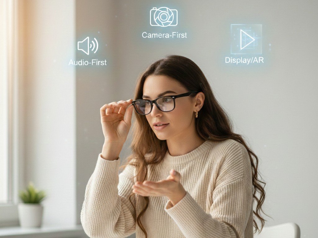 Camera-First Smart Glasses: Recording and photography built into wearable frames. Designed specifically for capturing first-person perspective content. May include basic audio features but no display projection.