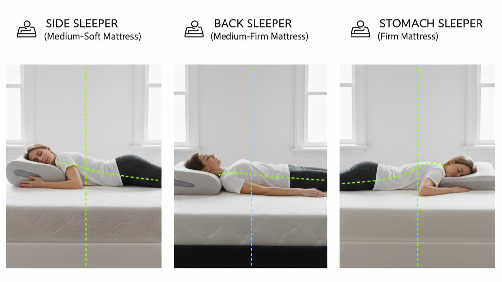 Side sleepers: Need softer (4-6 on scale). Shoulders and hips must sink while spine stays straight.