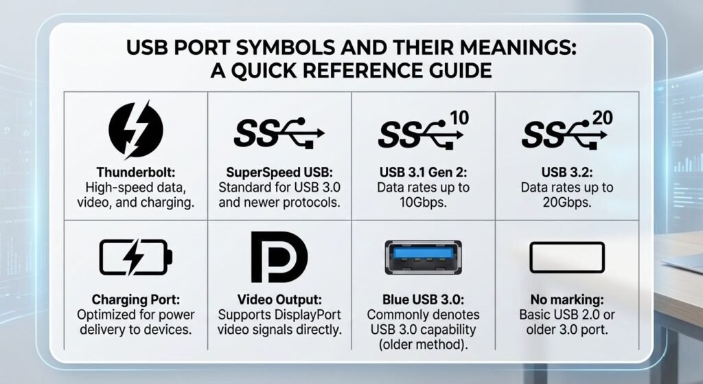Lack of symbols: Many USB-C ports have no markings. This often indicates USB 2.0 (480 Mbps) or basic USB 3.0 (5 Gbps) without advanced features.